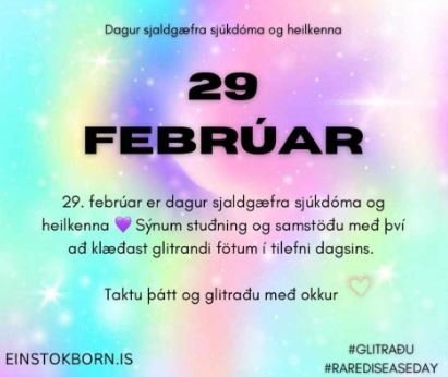29. febrúar. Glitraðu með þeim með því að klæðast einhverju glitrandi eins og glimmeri og pallíettum. Allt sem er litríkt og glitrar er skemmtilegt og minnir á að börn eru alls konar. Þá óska þau eftir að allir sem glitra verði sýnileg með því að deila glitrandi myndum á samfélagsmiðlana og merkja félaginu @einstokborn #einstok.born #rarediseaseday #glitraðu. Með þátttöku sem flestra í þessari vitundavakningu vekja þau meiri athygli á að hátt í 700 börn og ungmenni glíma við erfiðar og fátíðar greiningar sem afar fáir þekkja eða skilja.