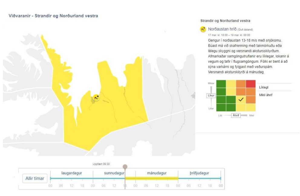 Gul veðurviðvörun tekur gildi kl.12.00 á hádegi í dag og gildir til kl. 12.00 á hádegi á morgun, mánudaginn 18. mars. Á veður.is segir að þetta skelli á með norðaustan 13-18 m/s og snjókomu. Búast má við skafrenning með takmörkuðu eða lélegu skyggni og versnandi akstursskilyrðum. Afmarkaðar samgöngutruflanir eru líklegar, lokanir á vegum og tafir í flugsamgöngum. Fólki er bent á að sýna varkárni og fylgjast með veðurspám. Vegfarendur eru hvattir til að fylgjast vel með færð og veðri á vefjum Veðurstofunnar og Vegagerðarinnar.