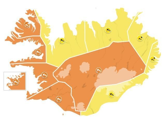 Appelsínugul viðvörun hefur verið gefin út fyrir höfuðborgarsvæðið, Suðurland, Faxaflóa, Breiðafjörð, Vestfirði og Miðhálendi en gul viðvörun fyrir aðra hluta landsins.