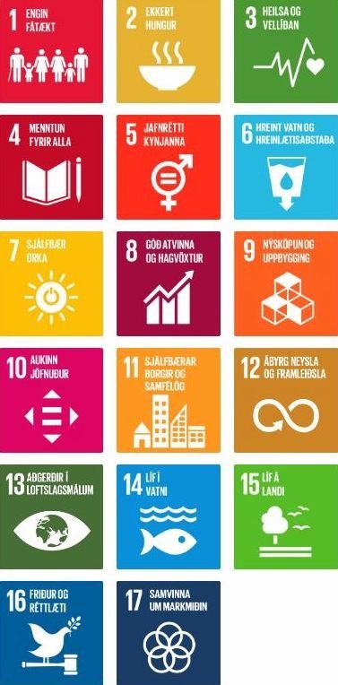 En hver skyldu svo þessi markmið vera? Þau eru m.a. að finna á vefslóðinni heimsmarkmidin.is og eru: Engin fátækt, ekkert hungur, heilsa og vellíðan, menntun fyrir alla, jafnrétti kynjanna, hreint vatn og hreinlætisaðstaða, sjálfbær orka, góð atvinna og hagvöxtur, nýsköpun og uppbygging, aukinn jöfnuður, sjálfbærar borgir og samfélög, ábyrg neysla og framleiðsla, aðgerðir í loftslagsmálum, líf í vatni, líf á landi, friður og réttlæti og að endingu samvinna um markmiðin.