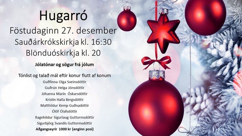 Þann 27. desember ætla vinkonur að koma saman, annars vegar í Sauðárkrókskirkju kl.16:30 og síðan í Blönduóskirkju kl. 20, og flytja tónlist og talað mál eftir konur eða sem hefur verið samin til kvenna. Vinkonurnar sem um ræðir eru á öllum aldri og eiga tengingu við Norðurland vestra og flestar búa þær í Skagafirði. „Hugljúf stund í skammdeginu og góð leið til að slaka á um jólin,“ segir í tilkynningu.