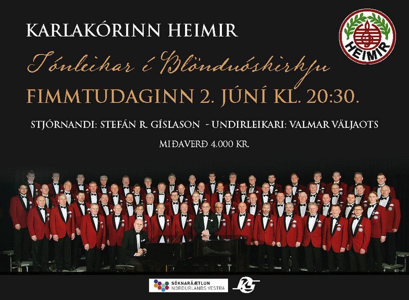 Heimismenn stefna á Blönduós í kvöld, fimmtudaginn 2. júní, og halda tónleika í Blönduóskirkju kl. 20:30. Stjórnandi er Stefán R. Gíslason og undirleikari er Valmar Väljaots.