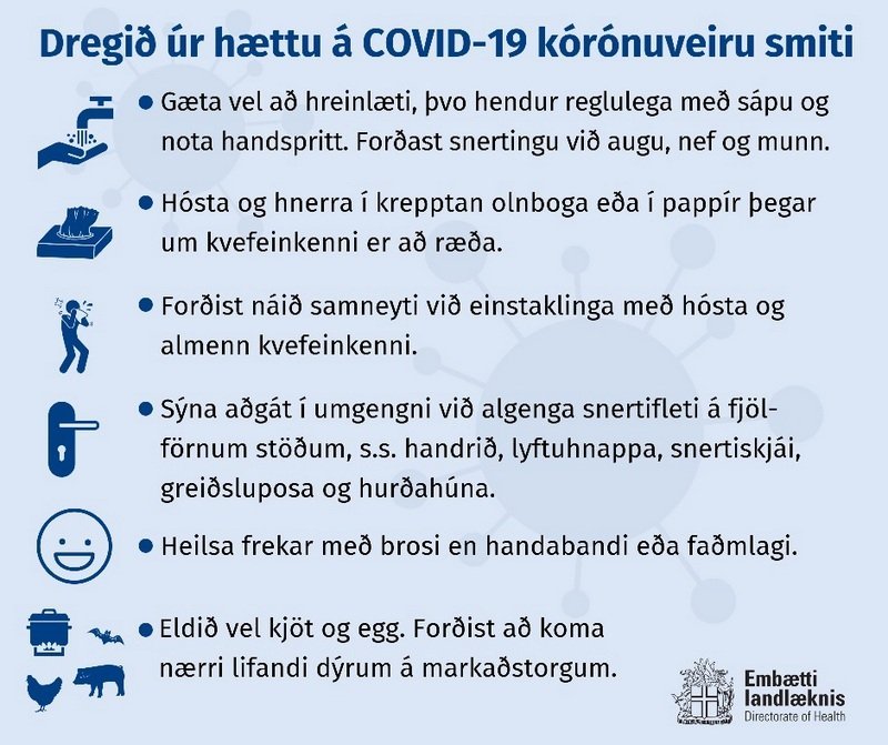Á vef landlæknisembættisins er að finna leiðbeiningar til almennings vegna COVID-19 veirunnar. Sjá einnig á vef almannavarna og á Facebooksíðunni Almannavarnadeild ríkislögreglustjóra.