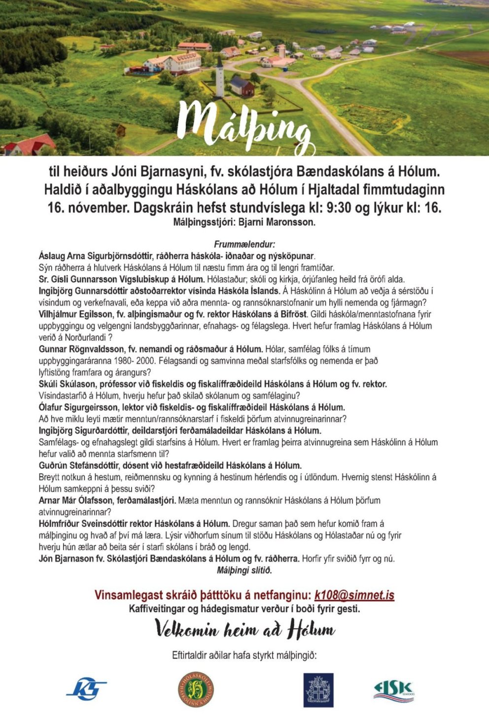Allir eru velkomnir heim að Hólum til þátttöku á þessu Málþingi til heiðurs Jóns Bjarnasonar með því að skrá sig á netfanginu: k108@simnet.is