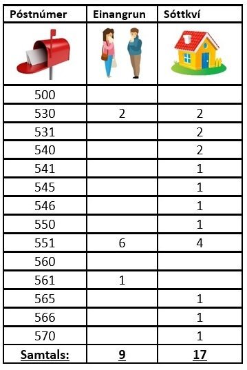 Níu einstaklingar eru í einangrun á Norðurlandi vestra, samkvæmt tölum aðgerðastjórnar svæðisins. Eitt nýtt smit greindist frá því í gær en viðkomandi var í sóttkví en alls sæta 17 aðilar nú sóttkví sem er mikil fækkun milli daga þar sem áður voru 39 manns í því úrræði, og í fyrsta sinn í þessari bylgju faraldursins í öllum póstnúmerum á Norðurlandi vestra.