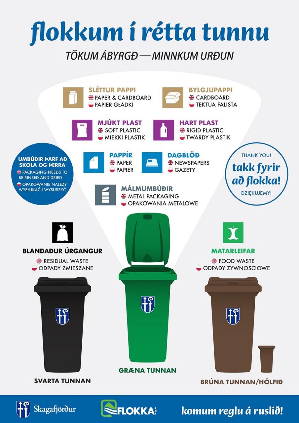 Flokka kynnir þessa dagana nýjung varðandi flokkun í Svf. Skagafirði. Breytingin felst í því að allt sem áður fór flokkað í poka í grænu tunnuna má nú fara laust í grænu tunnuna. Semsagt; engir glærir pokar lengur.
