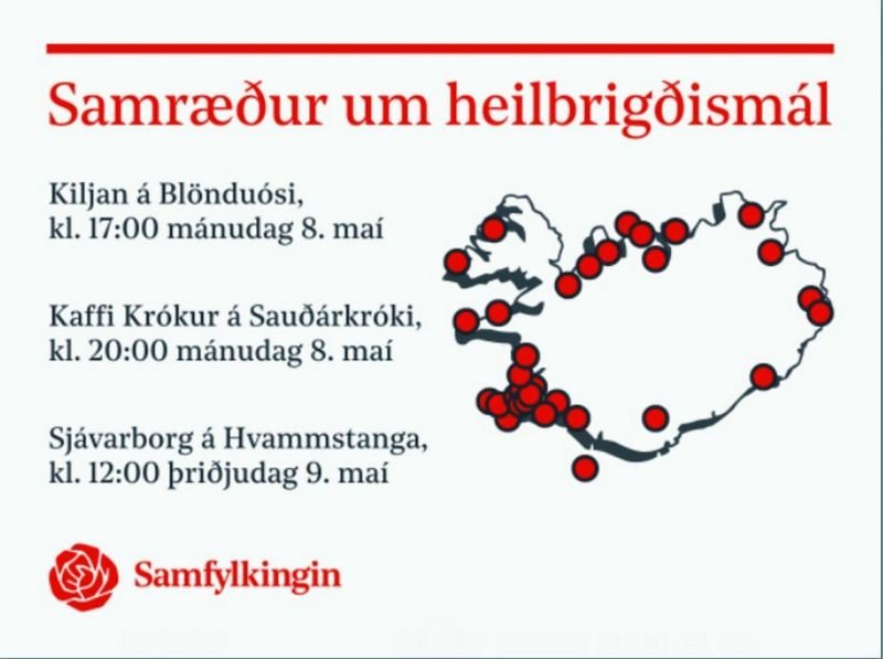 Samfylkingin hefur upp á síðkastið boðað til fjölda opinna funda um heilbrigðismál um land allt. Fundirnir eru opnir öllum og liður í nýju og umfangsmiklu málefnastarfi sem Kristrún Frostadóttir formaður flokksins hefur ýtt úr vör. Þrír slíkir fundir um heilbrigðismál verða á Norðurlandi vestra dagana 8. og 9. maí og fara þeir fram á eftirfarandi stöðum: