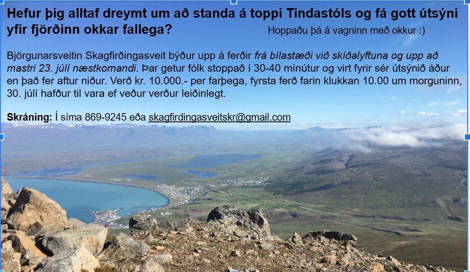 „Hefur þig alltaf dreymt um að standa á toppi Tindastóls og fá gott útsýni yfir fjörðinn okkar fallega?“ spyr Björgunarsveitin Skagfirðingasveit. Sá draumur getur nú ræst því sunnudaginn 23. júlí nk. mun björgunarsveitin bjóða upp á ferðir frá bílastæði við skíðalyftuna og upp að mastri.