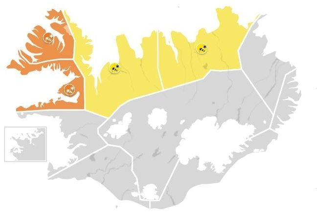 Ekkert lát er á lægðarkomum og tilheyrandi veðurofsa því Veðurstofan hefur gefið út appelsínugula viðvörun fyrir Breiðafjörð og Vestfirði en fyrir Strandir og Norðurland vestra og Norðurland eystra er viðvörunin gul og tekur gildi um og upp úr hádegi í dag.