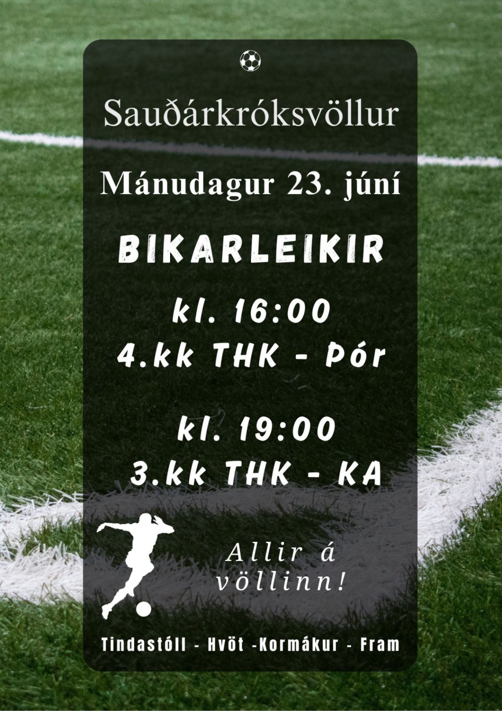 Barna- og unglingaráð knattspyrnudeildar Tindastóls vill vekja athygli á því að í dag, mánudaginn 23. júní, verða spilaðir tveir bikarleikir á Sauðárkróksvelli.