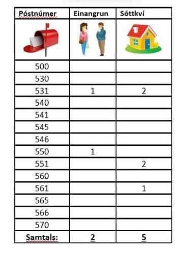 Sitthvor aðilinn sem er í einangrun er annars vegar á Sauðárkróki og hinn í Húnaþingi vestra þar sem tveir sitja í sóttkví. Í Skagafirði eru þrír í sóttkví, tveir í póstnúmerinu 551 og einn í 561. Alls liggja nú 23 einstaklingar á sjúkrahúsi og þrír á gjörgæslu, 4.296 í sóttkví og 1.740 í skimunarsóttkví.