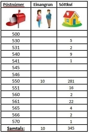 Í áðurnefndri tilkynningu kemur fram að einn hinna smituðu muni taka út sína einangrun í öðru sveitarfélagi og fækkar því um einn í yfirliti Skagafjarðar en skráning hans færist því annað. Alls eru 345 manns í sóttkví á Norðurlandi vestra, 39 færra en í gær, flestir á Sauðárkróki eða 281.