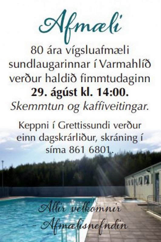 Haldið verður upp á 80 ára vígsluafmæli sundlaugarinnar í Varmahlíð nk. fimmtudag, þann 29. ágúst. Afmælishátíðin hefst klukkan 14:00 með skrúðgöngu frá Varmahlíðarskóla en að henni lokinni tekur við dagskrá með ræðuhöldum, dansi og söng og einnig verður boðið upp á kaffiveitingar.
