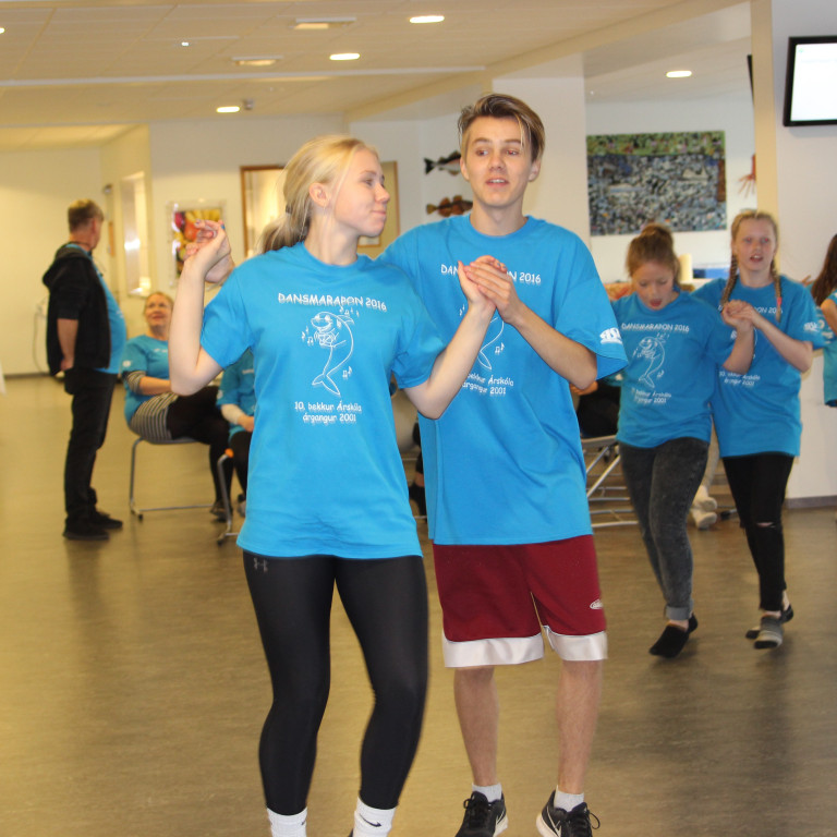 Hið árlega og sívinsæla dansmaraþon 10. bekkinga Árskóla á Sauðárkróki hófst kl. 11 í morgun og er nú komið að árgangi 2001 að teygja skankana í sólarhring. Danssýning allra nemenda klukkan 17:00 í íþróttahúsinu.