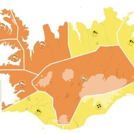 Gul og appelsínugular viðvaranir eru í gildi á landinu vegna mjög djúprar lægðar sem væntanleg er inn á Grænlandshaf í dag og mun senda skil yfir landið með stormi eða roki, talsverðri rigningu og hlýnandi veðri. Búast má við mjög hvössum og varhugaverðum vindhviðum við fjöll á Ströndum og Norðurlandi vestra, staðbundið yfir 40 m/s. Víðtækar samgöngutruflanir líklegar og ekkert ferðaveður er á meðan viðvörunin er í gildi.