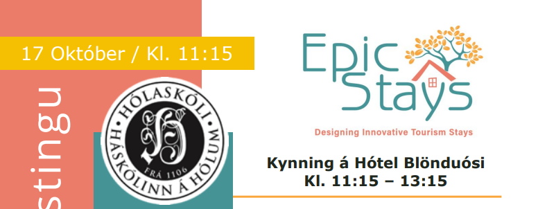 Kæru ferðaþjónar, samstarfsaðilar og þeir sem hafa áhuga uppbyggingu á einstökum gistimöguleikum. Þann 17.október, milli kl 11:15 - 13:15 verður Kjartan Bollason Lektor við Ferðamáladeild Háskólans á Hólum með kynningu á hagnýtu fræðsluefni um hönnun “epísks” gistirýmis á Hótel Blönduósi. Auk þess verður nýuppgert gistirými á Hótel Blönduósi skoðað. Boðið verður upp á léttann hádegisverð og kaffi með sætum bita. Nauðsynlegt er að skrá sig fyrir fimmtudaginn 16.október á netfangið blonduos@laugarbakki.is Við hlökkum til að taka á móti ykkur og ræða saman um einstaka gistimöguleika og ferðaþjónustu. Starfsfólk Hótel Blönduós
