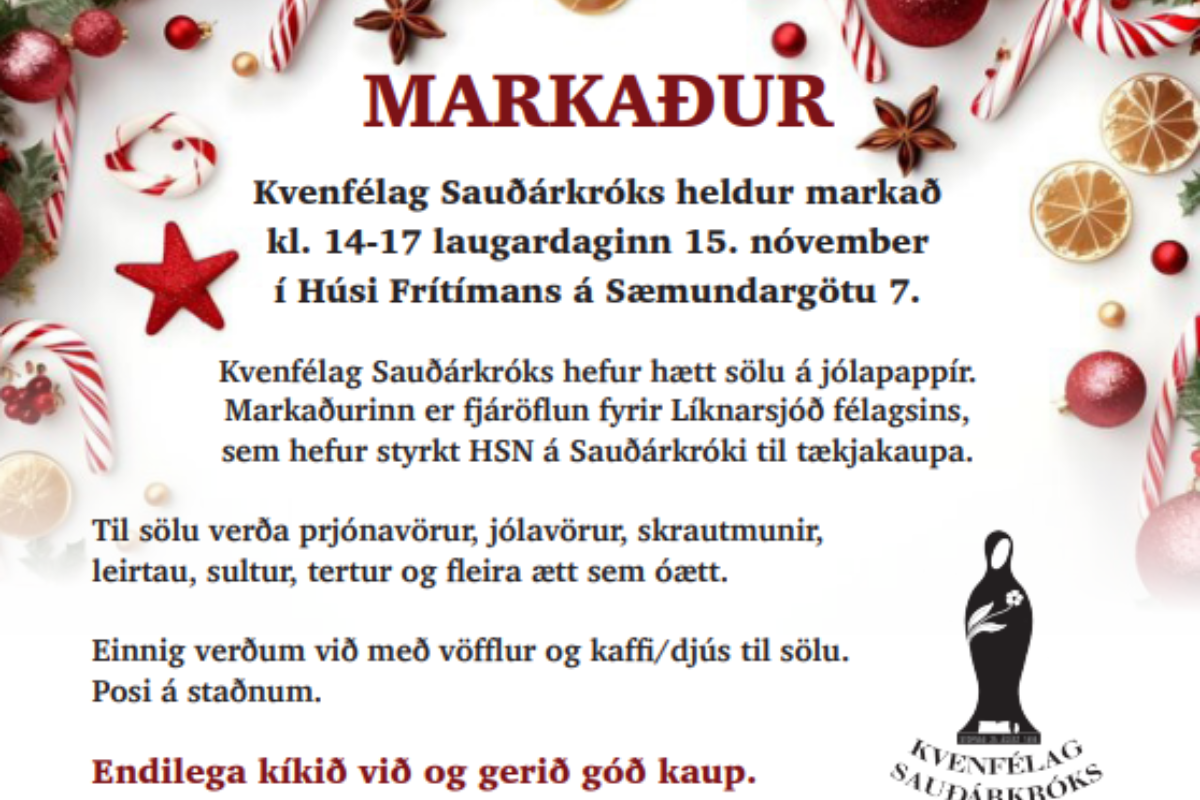 Kvenfélag Sauðárkróks heldur markað kl. 14-17 laugardaginn 15. nóv. í Húsi frítímans á Sæmundargötu 7.