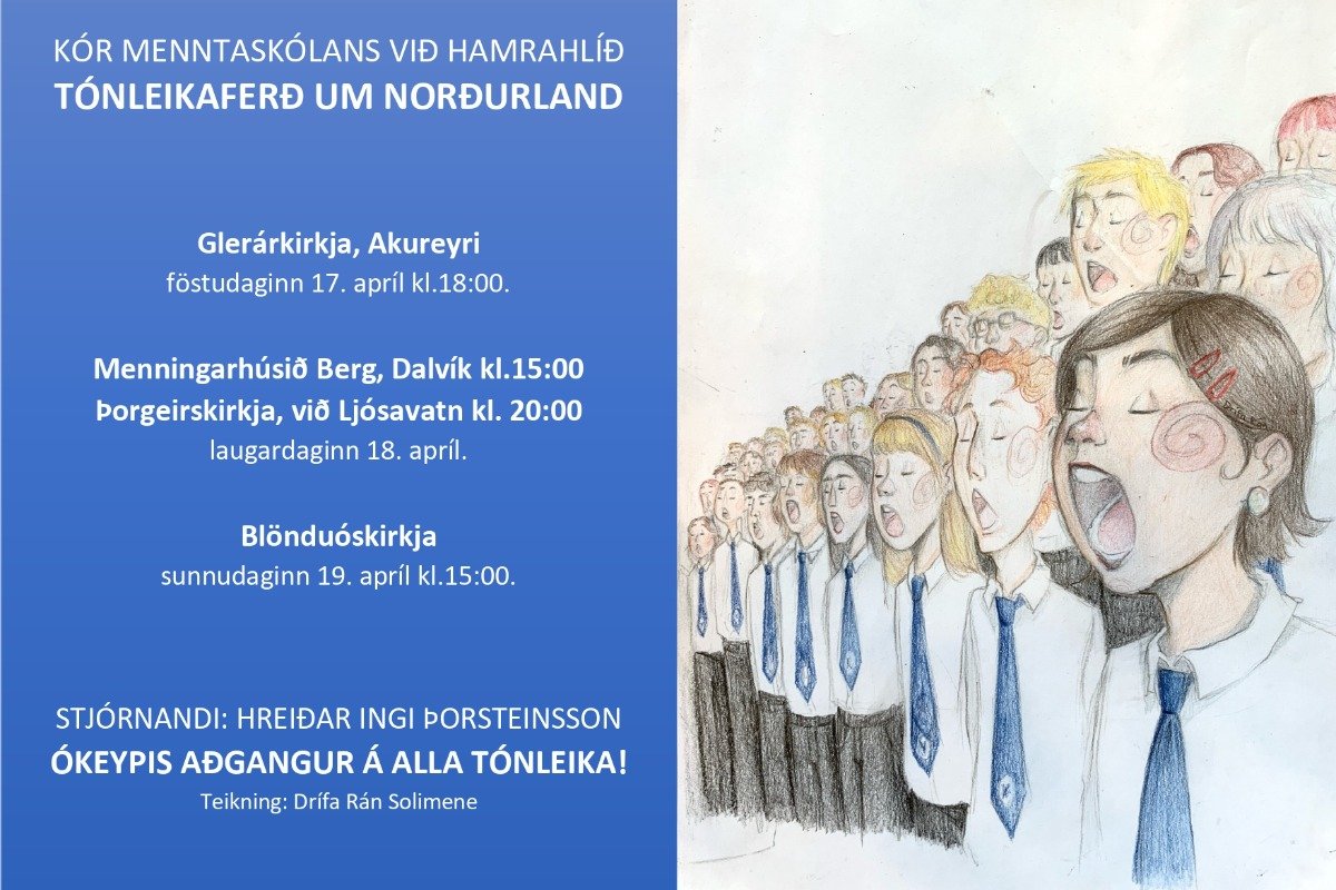 Sunnudaginn 19. apríl heldur Kór Menntaskólans við Hamrahlíð tónleika í Blönduóskirkju kl.15:00. Um 80 ungmenni á aldrinum 16-19 flytja þekktar kórperlur í bland við nýleg kórverk. Þau sjá einnig um kynningar og skýra tilurð laga og ljóða. Stjórnandi er Hreiðar Ingi Þorsteinsson. Aðgangur er ókeypis!